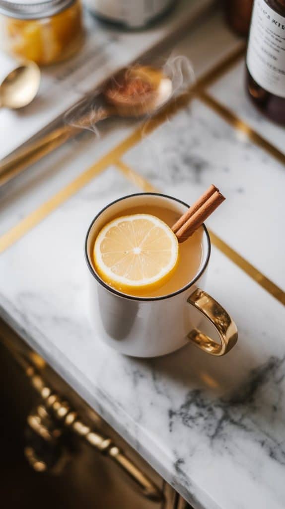 Stir the drink with a cinnamon stick, garnish with a lemon slice, and enjoy immediately.
