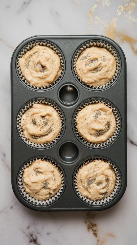 Scoop the batter evenly into the muffin tin, filling each cup about ¾ full.