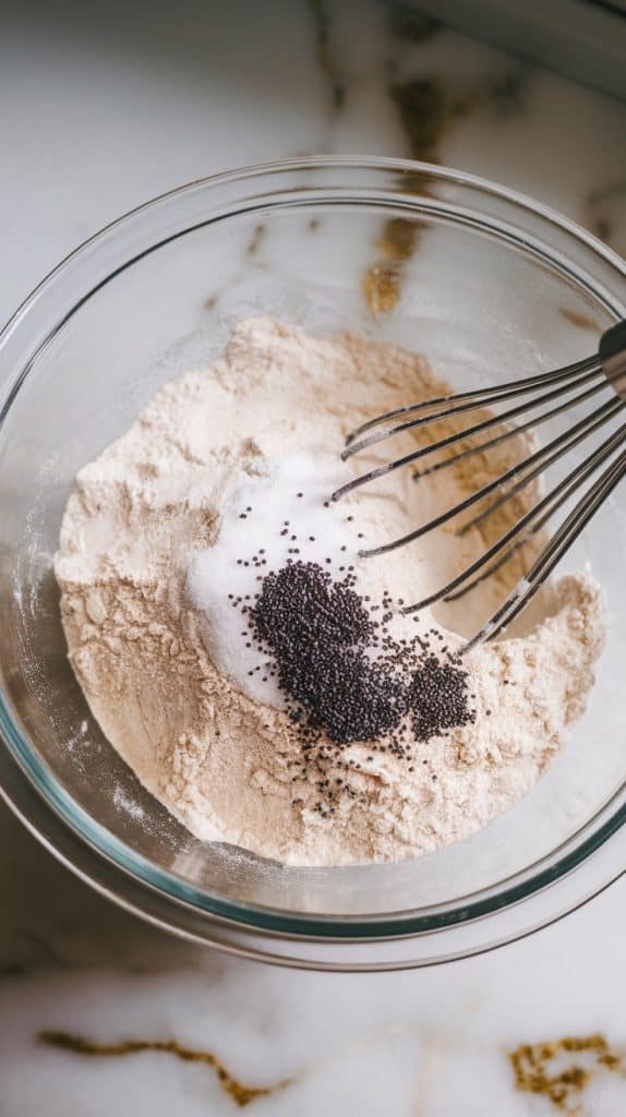 In a large bowl, whisk together the flour, baking powder, baking soda, salt, and poppy seeds.
