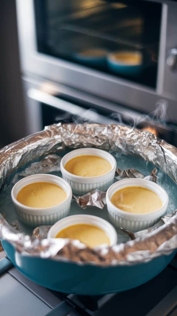 Place ramekins in a large baking dish. Pour hot water into the dish until it reaches halfway up the sides of the ramekins. Cover with foil and bake at 325°F (160°C) for 30-35 minutes, or until the custard is just set.