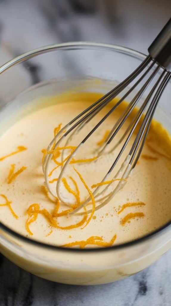 Close-up shot from the top of Meyer lemon zest being whisked into the custard mixture, showing flecks of zest in the creamy liquid