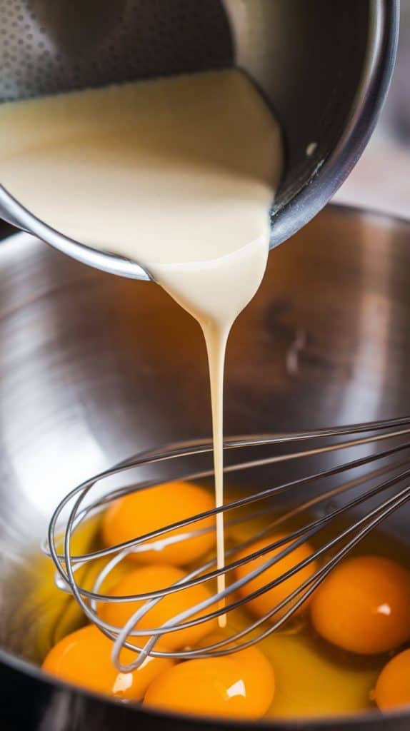In a mixing bowl, whisk the egg yolks. Slowly pour the warm cream mixture into the yolks, whisking constantly to avoid scrambling the eggs.
