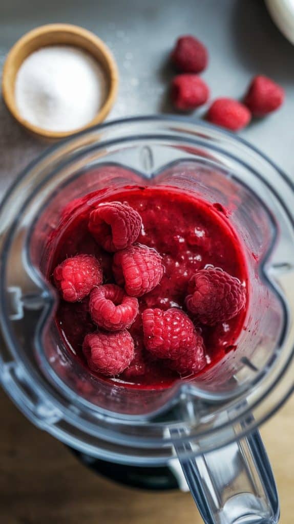 close up shot from the top of a blender with vibrant raspberry sauce inside, a small bowl of sugar, and raspberries scattered nearby