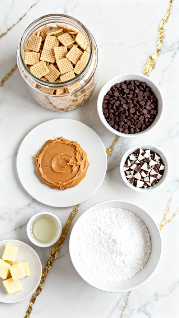 The cereal’s porous surface holds onto the melted chocolate well, and the powdered sugar sticks best when the chocolate is still slightly warm — not hot, not cool. Andes Mints have cocoa butter, which helps the chocolate melt smoother and mix evenly with the butter and chips.