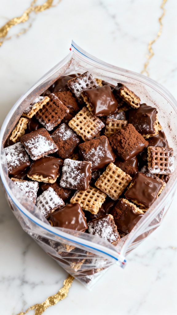 In a gallon-sized zip-top bag, add 1½ cups powdered sugar, 2 tbsp unsweetened cocoa powder, and ¼ tsp kosher salt. Add the chocolate-coated cereal. Seal and shake until everything is fully coated and no chocolate is showing.