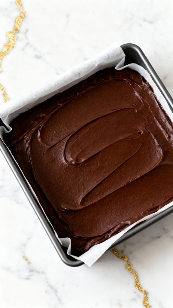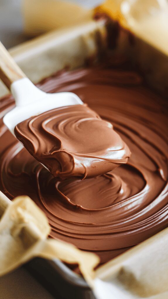 Line an 8×8 baking pan with parchment paper. Pour the fudge mixture into the pan and smooth the top with the spatula.