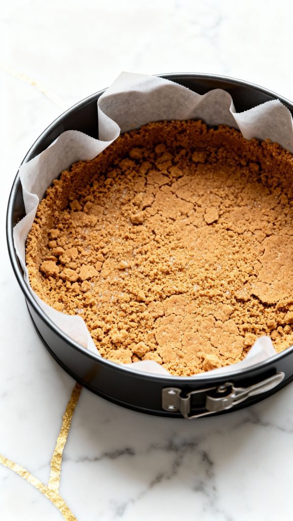 In a bowl, mix 1½ cups graham cracker crumbs, 6 tbsp melted butter, and 3 tbsp sugar until it looks like wet sand. Press the mixture firmly into the bottom of a 9-inch springform pan lined with parchment paper. Chill while you prepare the filling.