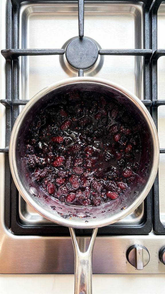 In a small saucepan, combine 1½ cups mulberries, 2 tbsp sugar, and 2 tsp lemon juice. Cook over medium heat until soft and bubbling, about 5–7 minutes. Stir in 1 tsp cornstarch mixed with 1 tbsp water and simmer 1–2 minutes until thickened. Let cool completely.