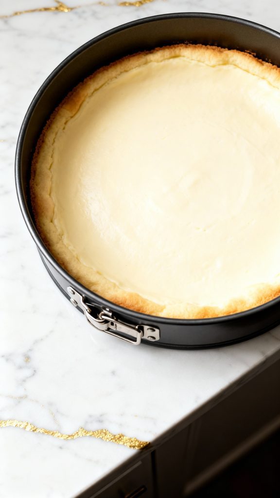 Pour the batter into the prepared crust. Tap the pan gently on the counter to release any air bubbles. Place the pan in a baking tray filled with hot water (water bath), and bake at 325°F (160°C) for 50 minutes. The edges should be set, and the center slightly jiggly. Turn off the oven, crack the door, and let it cool inside for 1 hour.