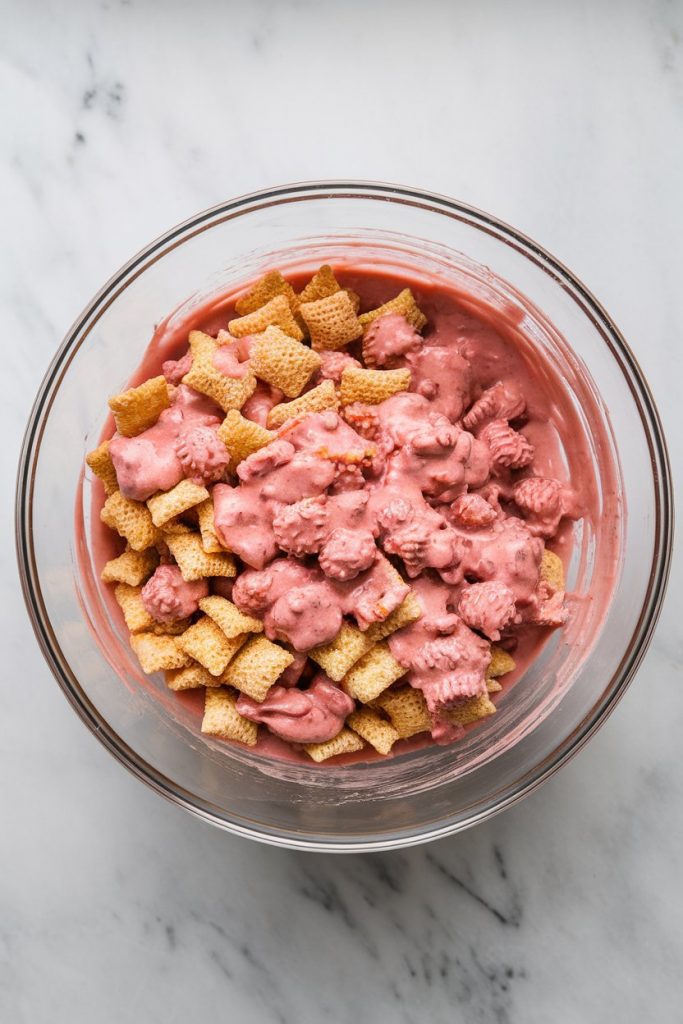 Pour the melted strawberry mixture over 3 cups of rice Chex in a mixing bowl. Stir gently to coat.
