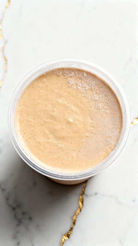 Pour the smooth light tan mixture into the Ninja Creami pint container. Secure the lid and freeze on a flat surface for 24 hours until completely solid.