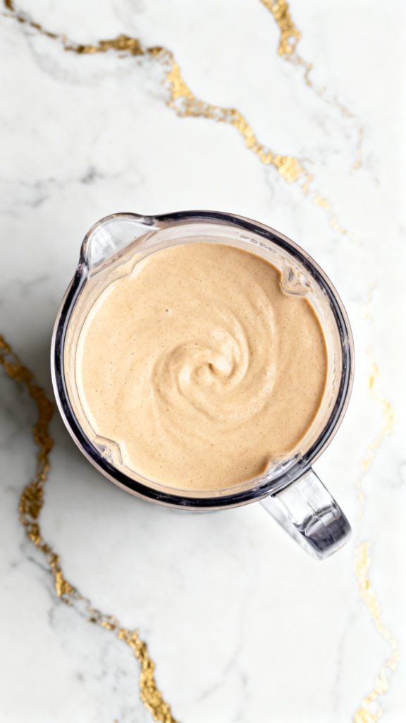 Add 1 ½ cups unsweetened vanilla almond milk, 1 scoop vanilla protein powder, 2 tablespoons Biscoff cookie butter, 1 tablespoon dry sugar-free vanilla pudding mix, 1–2 tablespoons granulated sweetener, and 1 pinch salt to a blender. Blend until completely smooth and creamy, with no visible powder.
