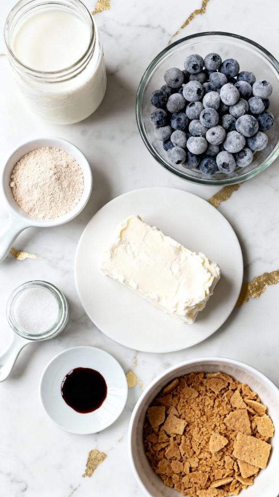 Add 1 cup Fairlife milk, 1 scoop vanilla whey protein powder, 2 tbsp softened low-fat cream cheese, ½ cup frozen blueberries, 1 tbsp sugar-free cheesecake pudding mix, 1 tbsp allulose, and ½ tsp vanilla extract (optional) into a blender. Blend until completely smooth—no chunks.