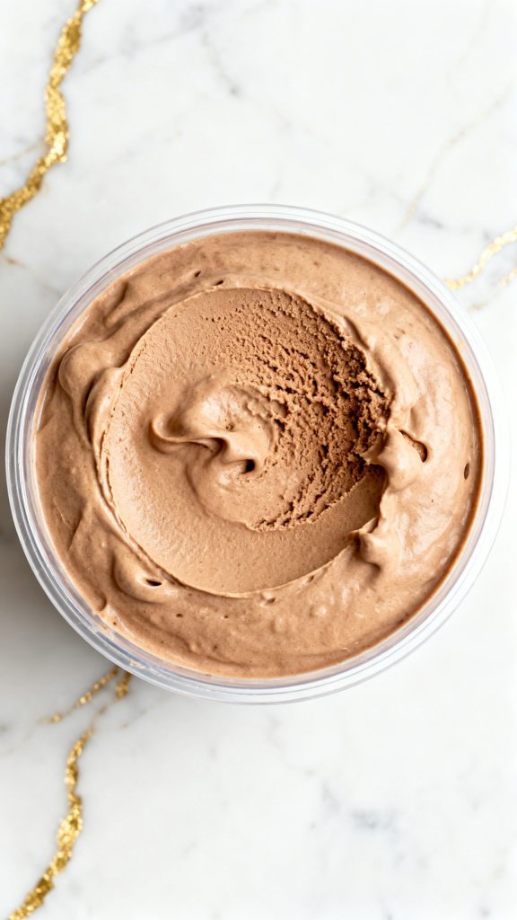 Scoop the thick, creamy mocha protein ice cream into a round white bowl. Smooth the top with the back of a spoon or create soft swirls. Serve right away for the best texture.