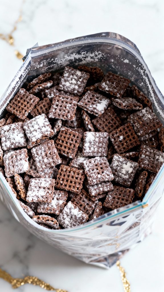 Transfer the coated cereal to a large zip-top bag or container with lid. Add 1 cup powdered sugar. Seal the bag and shake until every piece is coated.