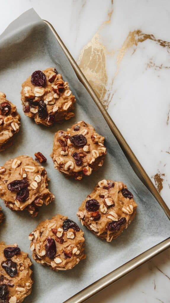 Preheat the oven to 350°F (175°C). Line a baking sheet with parchment paper. Scoop heaping tablespoons of dough (or use a cookie scoop) and space them 2 inches apart. Bake for 11–13 minutes or until edges are golden and centers look set.