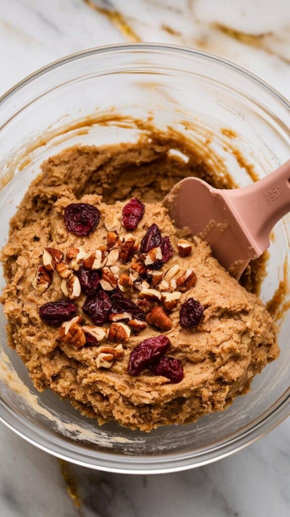 Add 1 cup dried cranberries and 3/4 cup chopped pecans. Stir to combine.