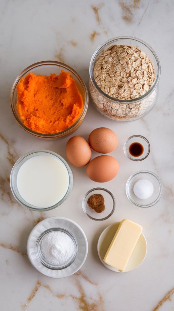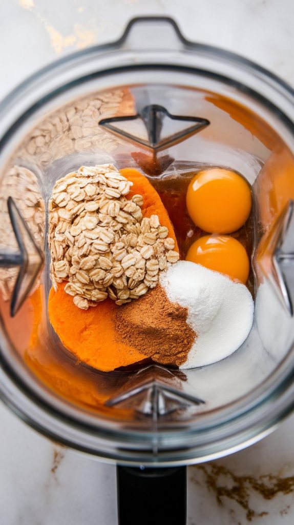 Add 1 cup mashed sweet potato, 1 ½ cups rolled oats, 2 large eggs, ½ cup milk, 1 tsp vanilla extract, 1 tsp cinnamon, 1 tsp baking powder, and ⅛ tsp salt to a blender.