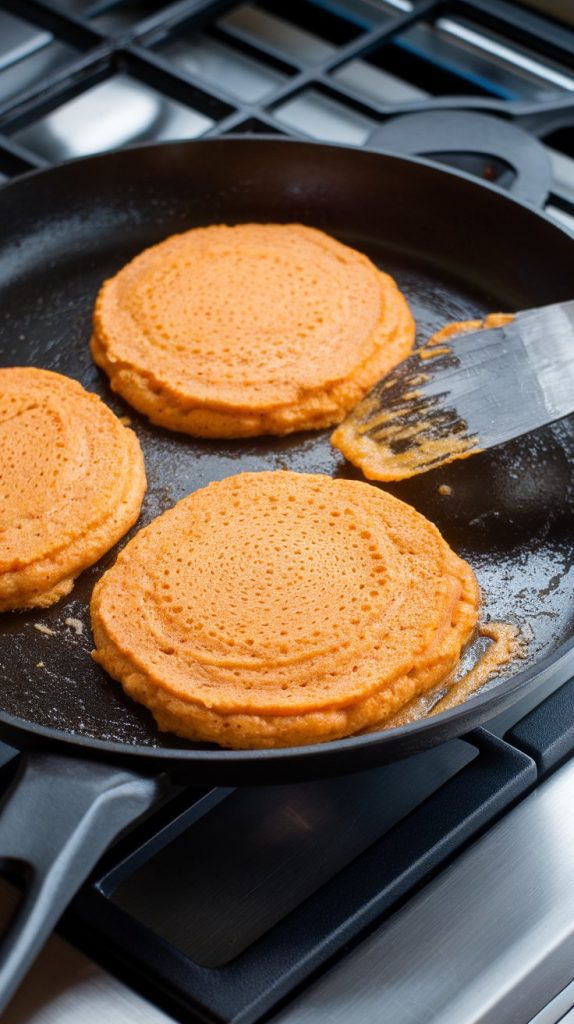 Pour about ¼ cup of batter onto the skillet for each pancake. Cook for 2–3 minutes until bubbles form on top and edges are set. Flip and cook another 1–2 minutes until golden brown and cooked through.