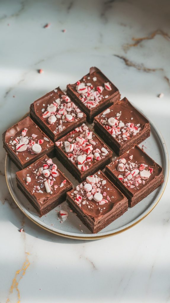Let brownies cool completely in the pan. Slice into 9 squares and top with extra crushed peppermint if you like.