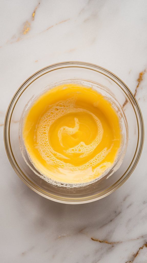 Melt ½ cup (1 stick) unsalted butter until fully liquid but not bubbling hot. Let it cool for 2–3 minutes so it doesn’t cook the eggs later.
