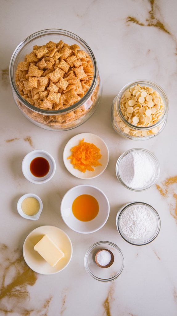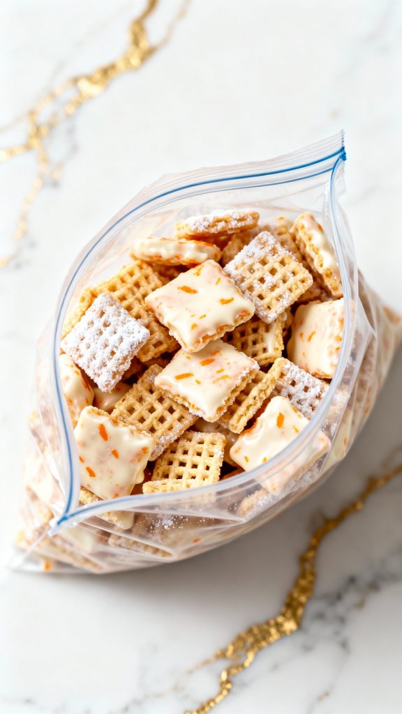 The melted white chocolate acts as a binder, coating the cereal and helping the powdered sugar and pudding mix stick. The fat in the butter smooths the chocolate and helps it coat more evenly. The pudding mix adds vanilla flavor and helps mimic that creamy creamsicle flavor without needing actual dairy or orange juice.