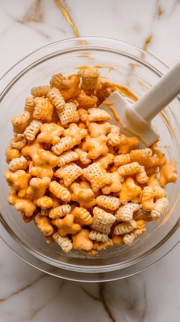 Pour the warm orange-chocolate mixture over the Rice Chex. Gently fold it together using a rubber spatula until all the cereal is coated evenly.