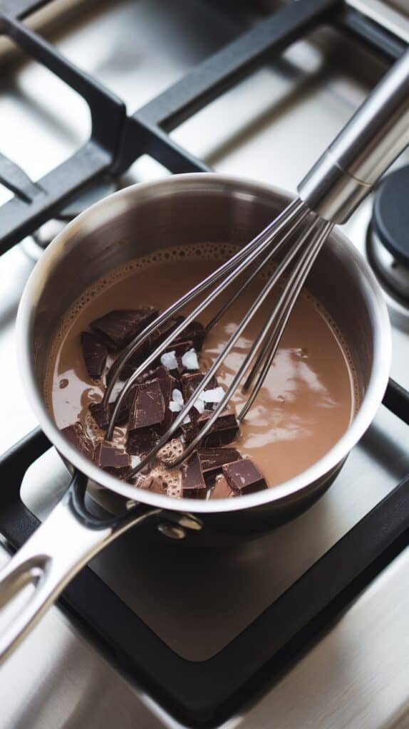 Add in 4 oz chopped dark chocolate and a pinch of salt. Stir slowly as it melts into the mix, creating a glossy, rich base.