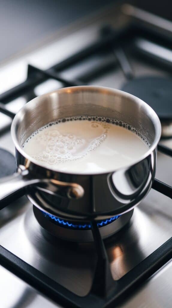 In a small saucepan, pour in 2 cups of whole milk and ½ cup of heavy cream. Warm over medium heat just until tiny bubbles form around the edges—don’t let it boil.
