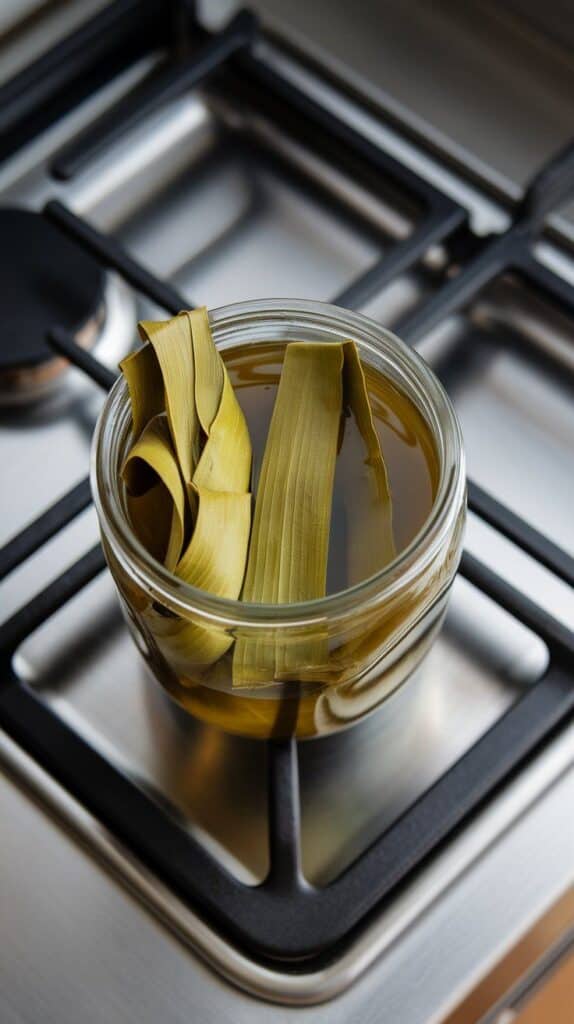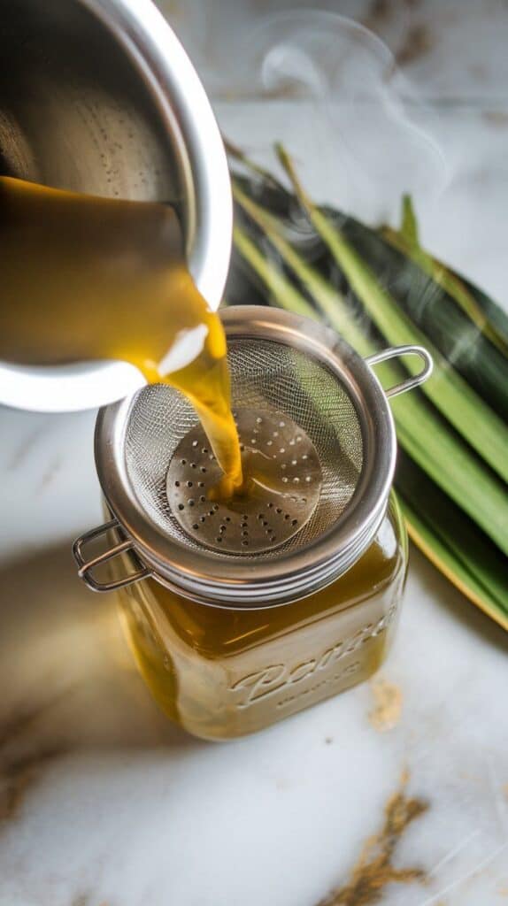 Simmer pandan leaves in freshly brewed green tea for 5 minutes to infuse.
