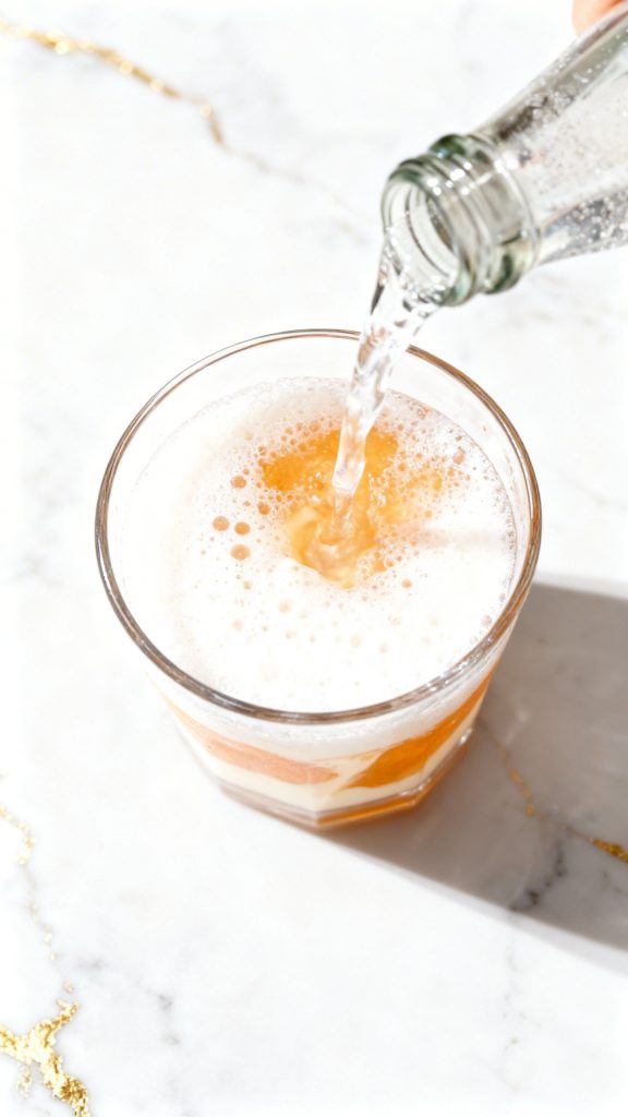 The soda adds carbonation, which lifts the flavors and makes the drink feel lighter. The cream softens the sharp fizz and gives a smooth texture. Peach syrup brings sweetness and fruit flavor that blends perfectly with citrus soda.