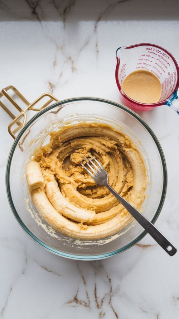 In a large mixing bowl, mash 2 ripe bananas (about 1 cup) until smooth with just a few lumps.