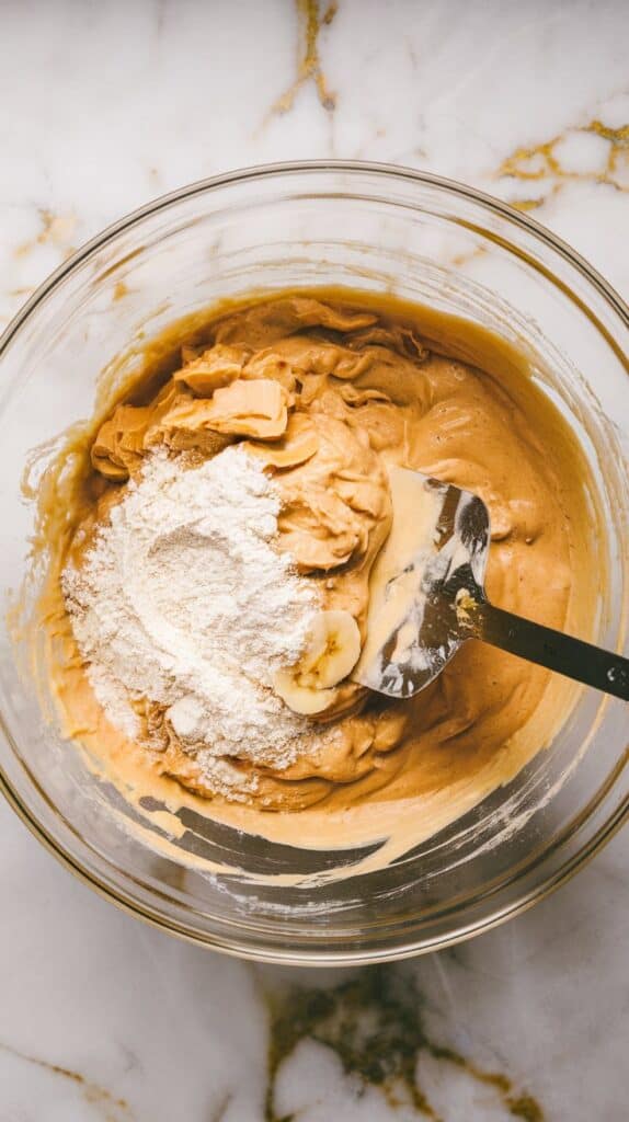 Sprinkle 1 1/2 cups flour, 1 tsp baking powder, 1/2 tsp baking soda, and 1/4 tsp salt over the wet mixture. Gently fold in with a spatula until just combined. Don’t overmix.