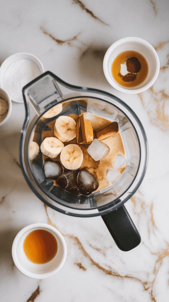 Pour in cold coffee, milk, peanut butter, frozen banana, honey, cinnamon, and ice.