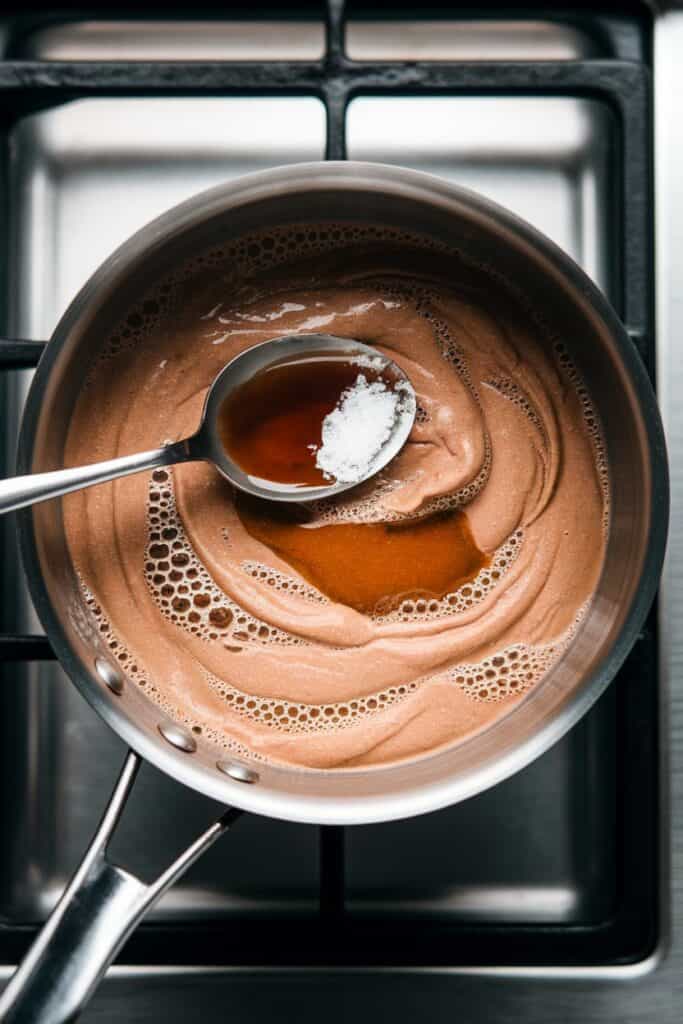 Turn off the heat. Stir in 1/4 teaspoon of vanilla extract and a pinch of salt. Whisk gently to finish blending.