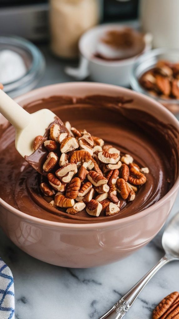 Remove the chocolate mixture from heat and stir in vanilla extract and the praline pecans, mixing until fully combined.