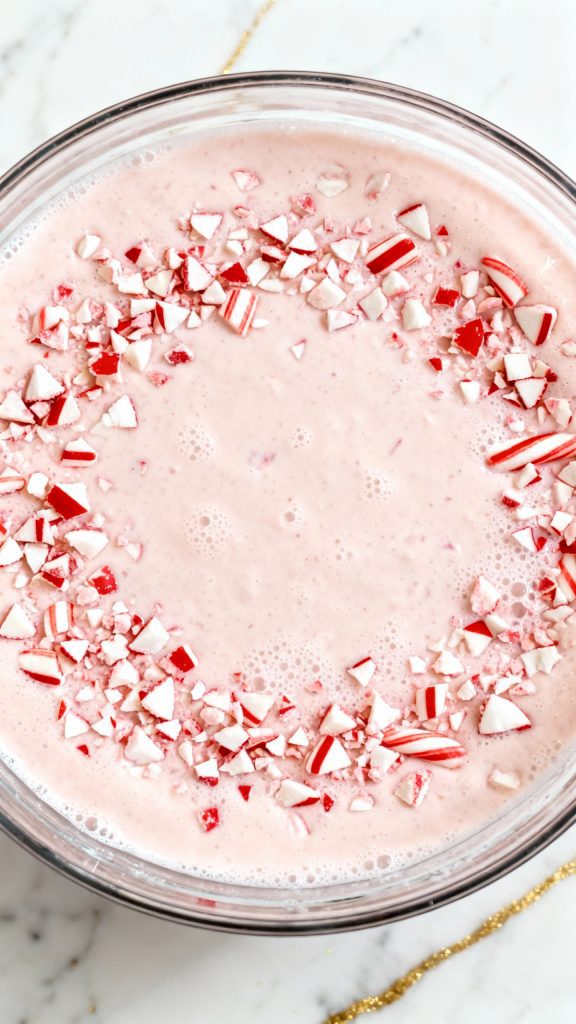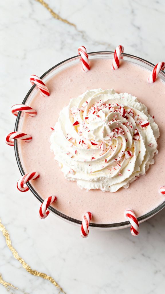 Top with whipped cream and a few more crushed candy canes. Add mini candy canes on the rim if you’d like.