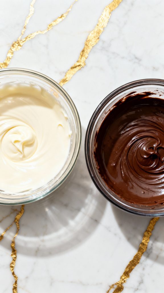 In separate microwave-safe bowls, melt 8 oz of white chocolate and 8 oz of semi-sweet chocolate in 30-second bursts, stirring between each, until smooth.