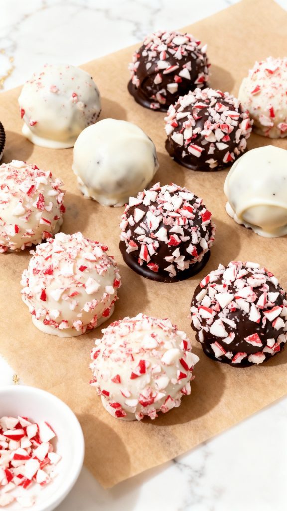 Make the Oreo balls (before dipping) up to 2 days ahead. Store them in the fridge, then dip in chocolate and decorate the day you serve for the freshest crunch from the peppermint topping.