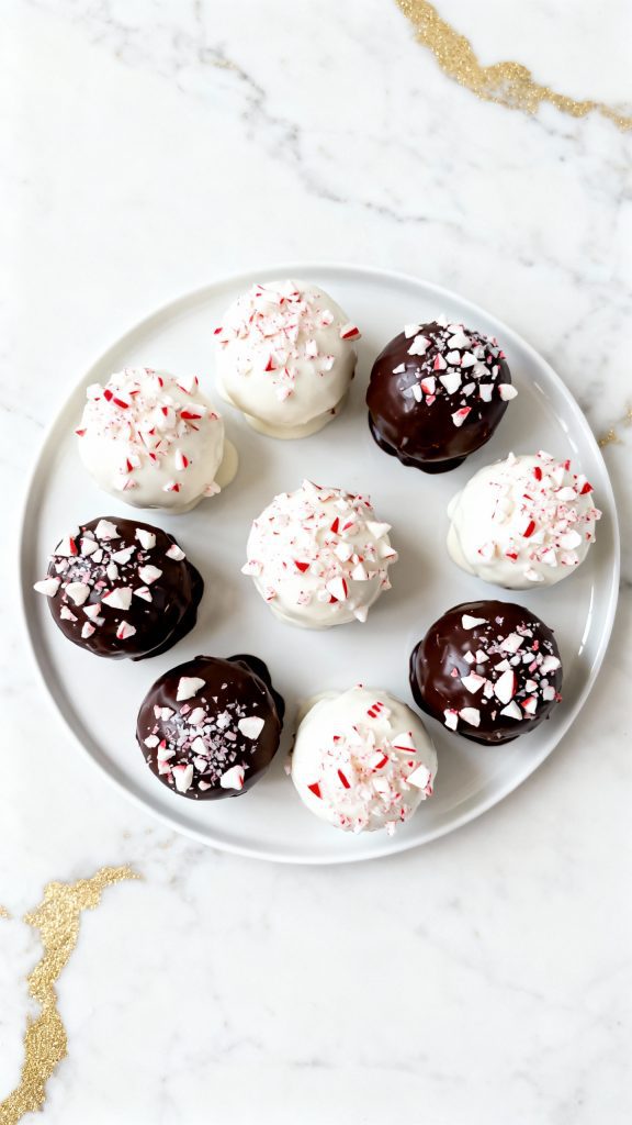 Immediately after dipping, sprinkle crushed peppermint candies on top of each coated ball before the chocolate sets.