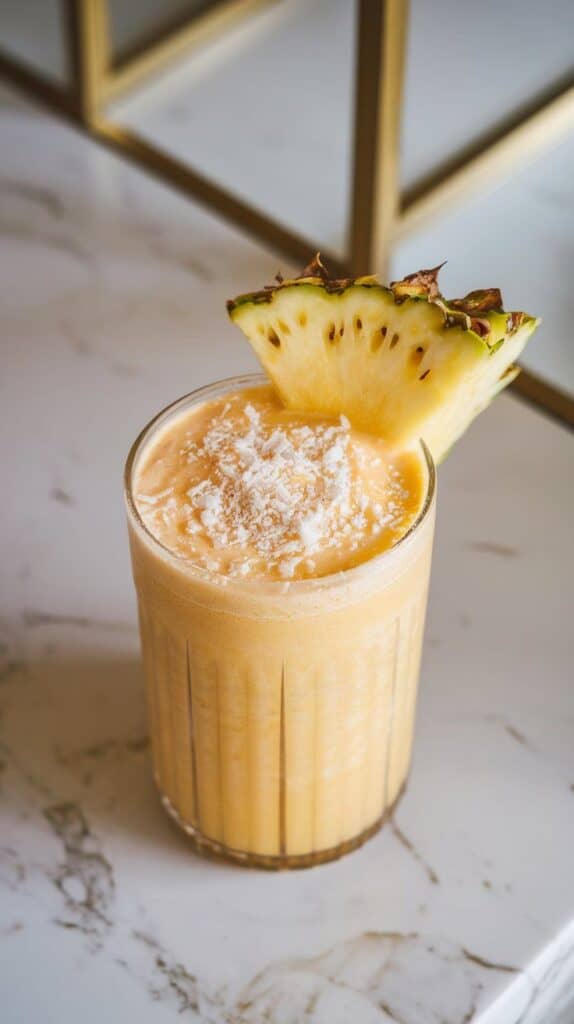 a thick pineapple coconut protein shake in a tall clear glass with a pineapple wedge on the rim and a sprinkle of shredded coconut on top