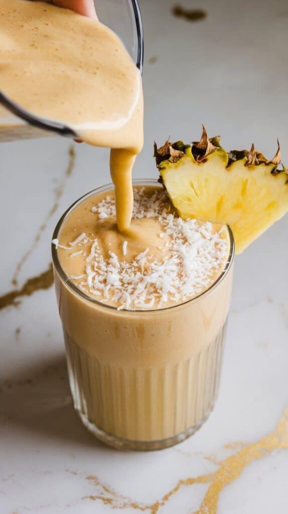 the creamy smoothie being poured into a tall glass, topped with shredded coconut and a pineapple wedge