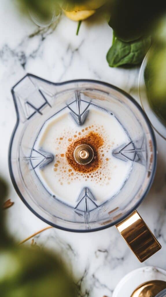 coconut milk being poured into the blender with vanilla extract already added, surrounding the other ingredients