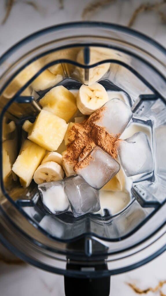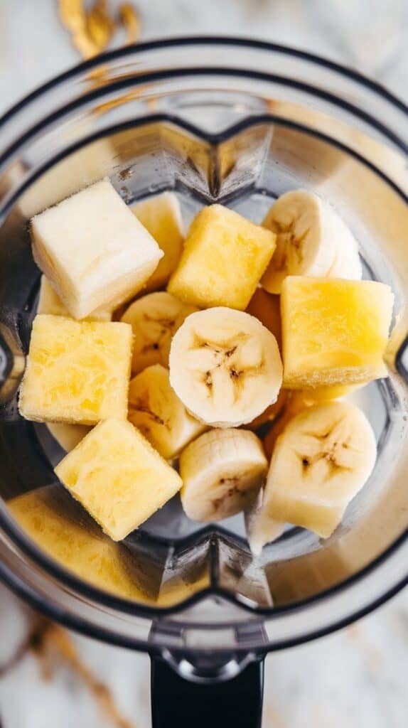 frozen pineapple chunks and banana slices placed into a blender, showing their texture and color