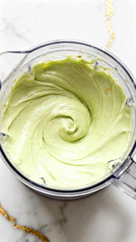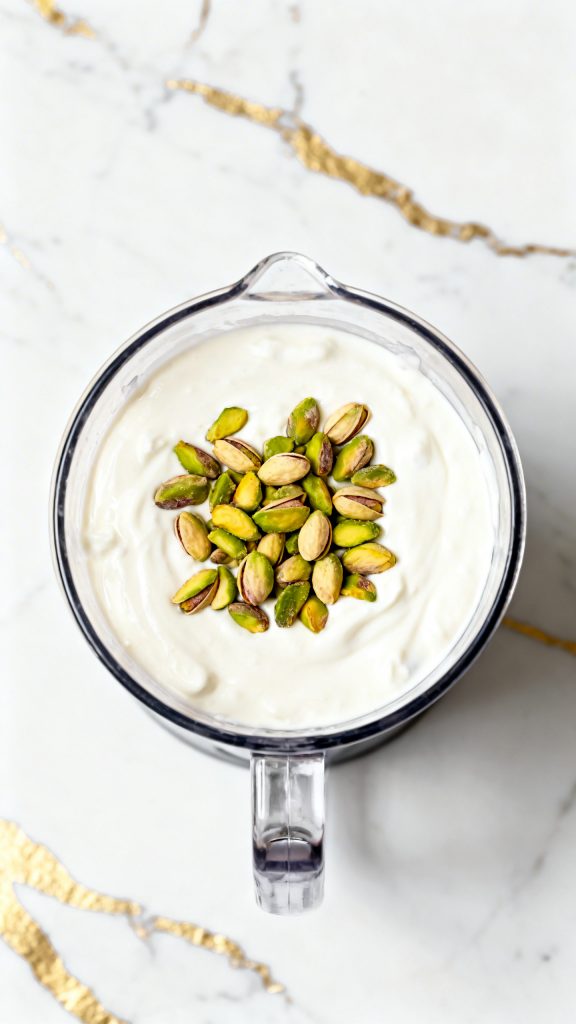 Add 1/2 cup shelled unsalted pistachios to the smooth cottage cheese mixture. Blend again for 1–2 minutes until completely smooth and pale green.