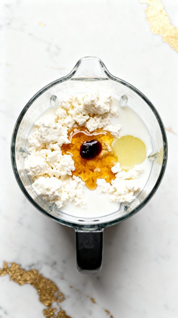 Add 2 cups full-fat cottage cheese, 3 tablespoons honey, 1/2 teaspoon vanilla extract, 1 tablespoon lemon juice, and 2 tablespoons milk to a blender. Blend for 1–2 minutes until completely smooth and creamy.