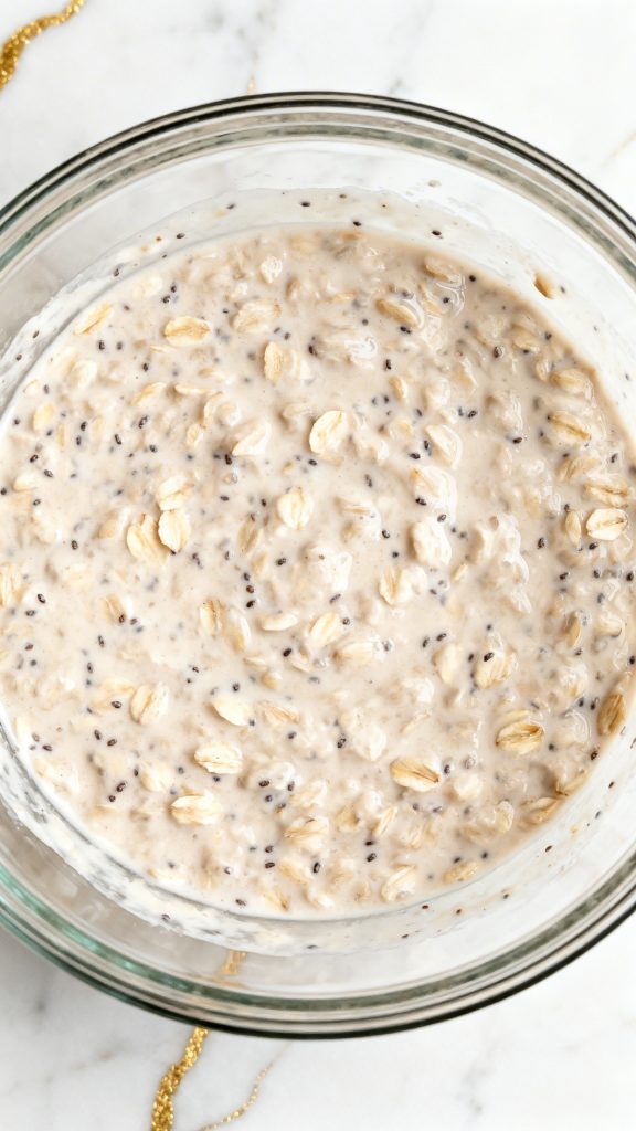 Chia seeds also help thicken the mixture. They absorb liquid and form a light gel, which gives the oats a pudding-like consistency.