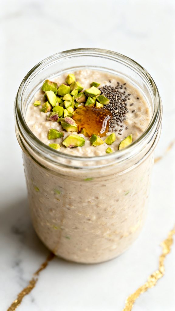 In the morning, stir the chilled oats. If they are too thick, mix in 1–2 tablespoons milk. Top with extra chopped pistachios and a drizzle of maple syrup if desired.