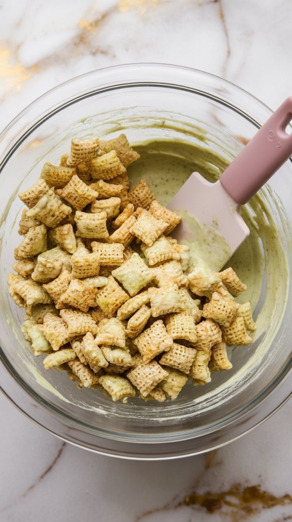 Pour the pistachio-coated mixture over the Rice Chex cereal. Gently fold with a spatula until all pieces are coated.