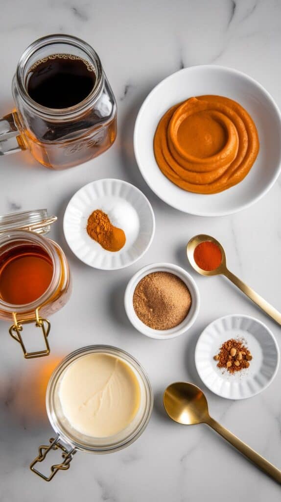 You can pre-mix the pumpkin, sugar, and spice into a little jar and just stir it into fresh coffee whenever you’re ready. The whipped cream can be whipped and stored in the fridge for 1–2 days.